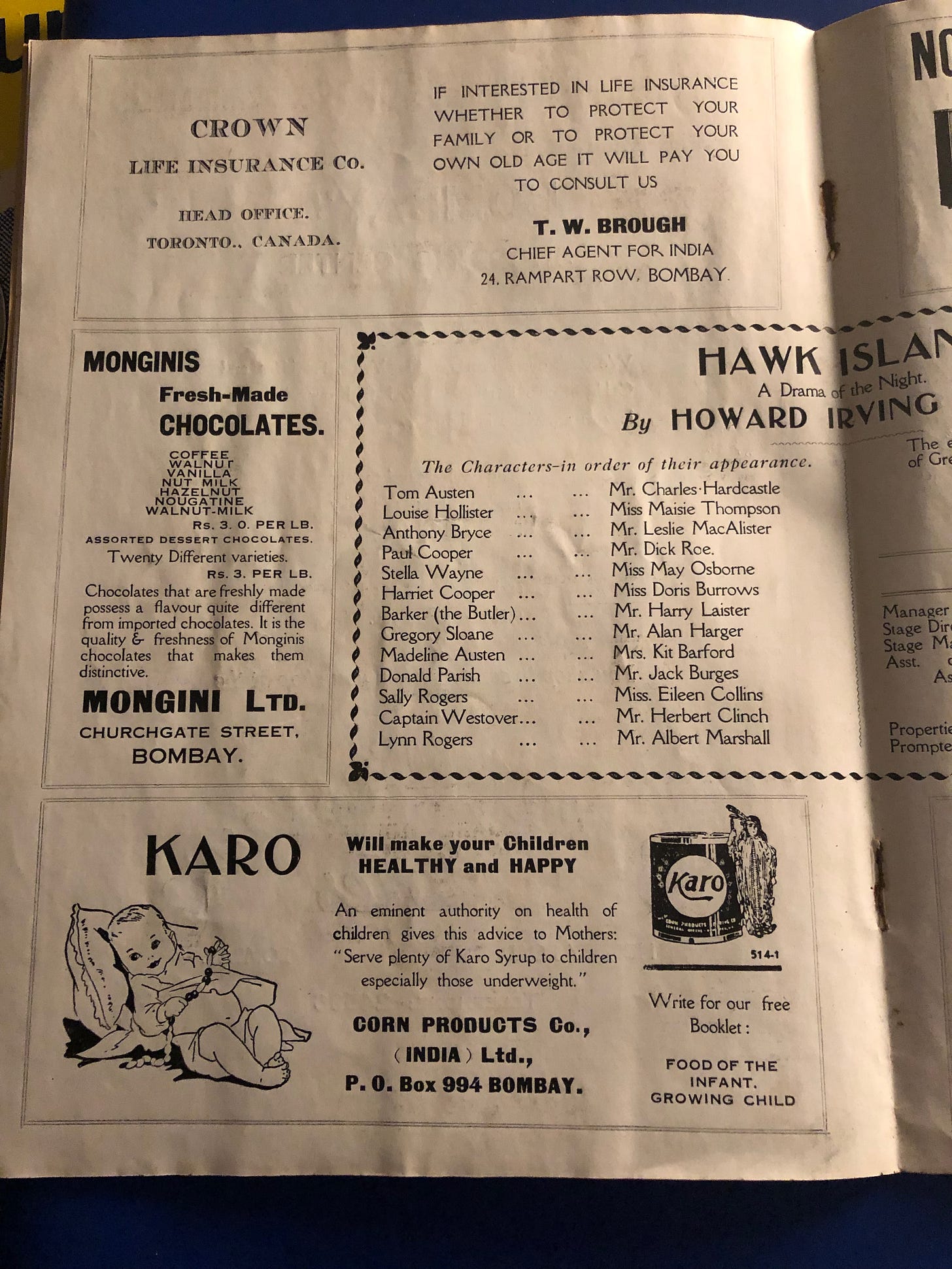 The year before their wedding, she appeared onstage in a production of a play called Hawk Island put on by the Bombay Amateur Dramatic Society. I have the playbill. Hawk Island was a murder-mystery play written by Henry Irving Young and produced on Broadway in 1929. There, it starred an up-and-coming young actor named Clark Gable. According to the playbill, in Bombay, Miss Doris Burrows, my grandmother, played the part of Harriet Cooper. The role had been originated in New York by one Miss Olga Lee.